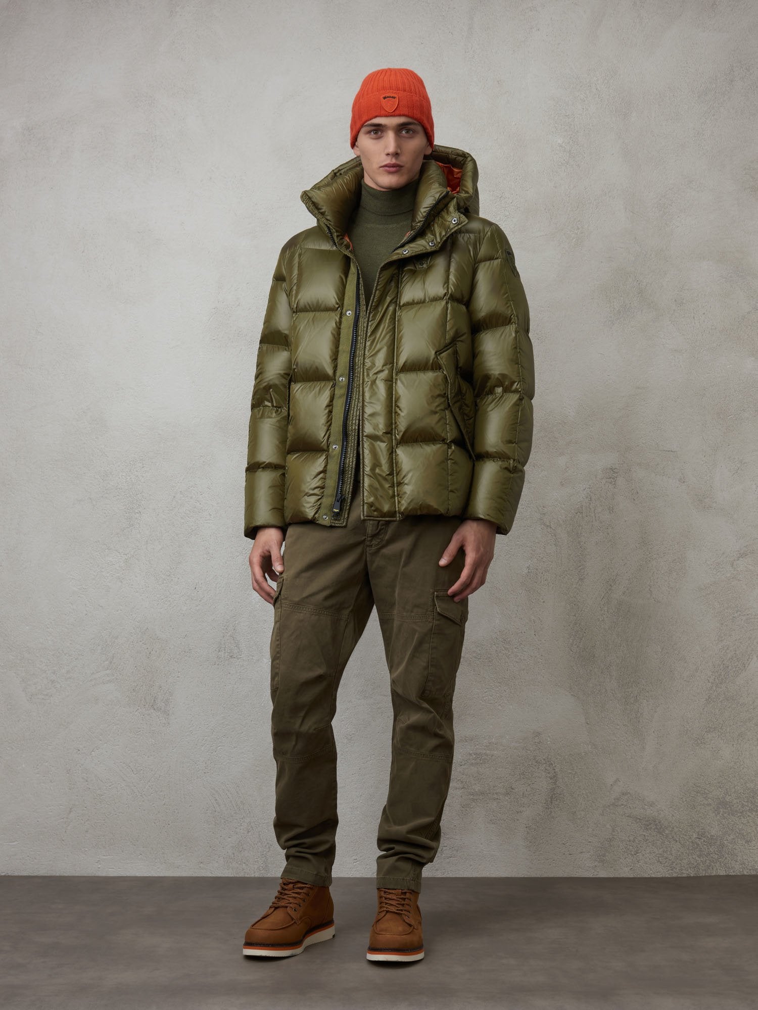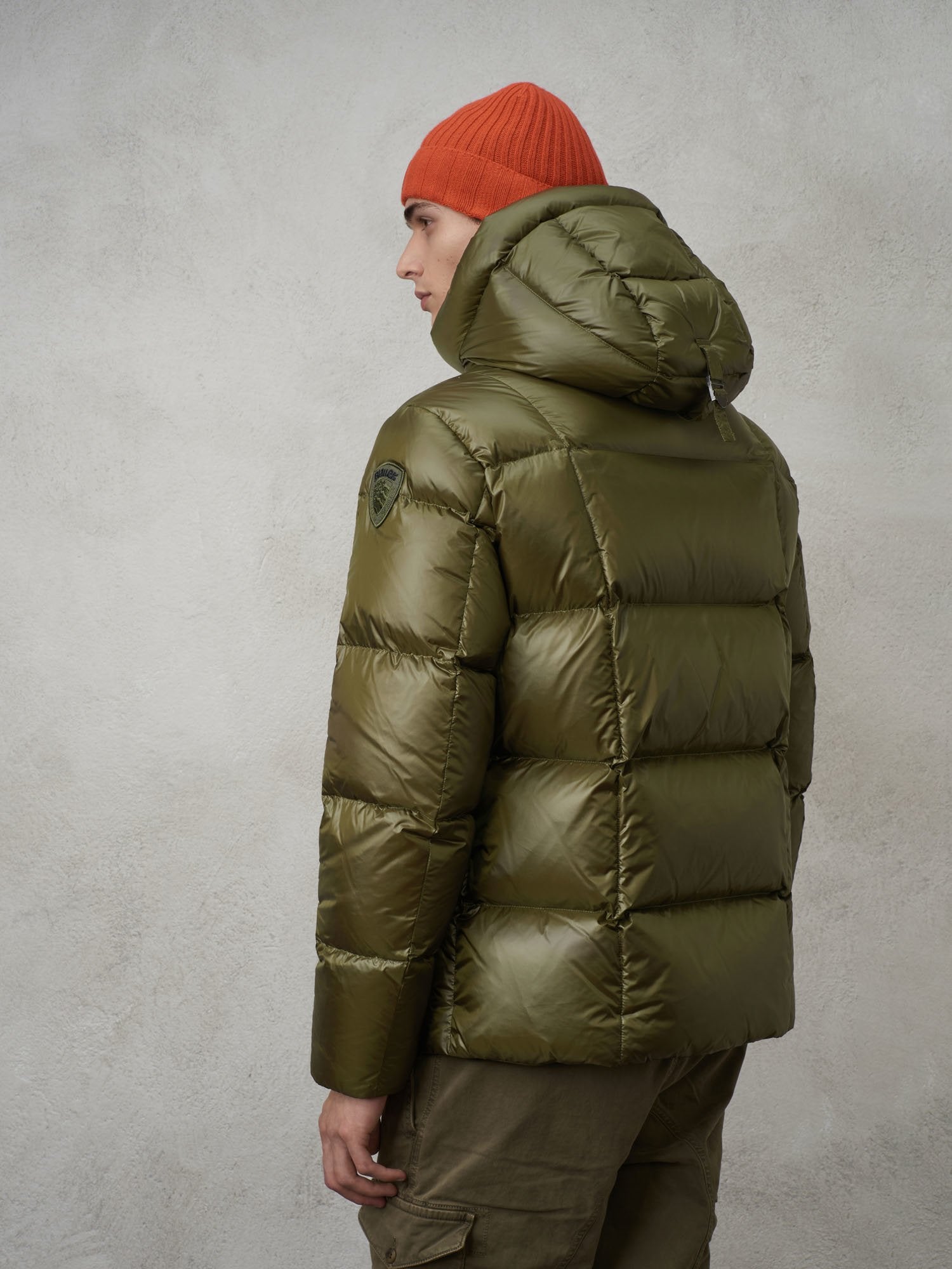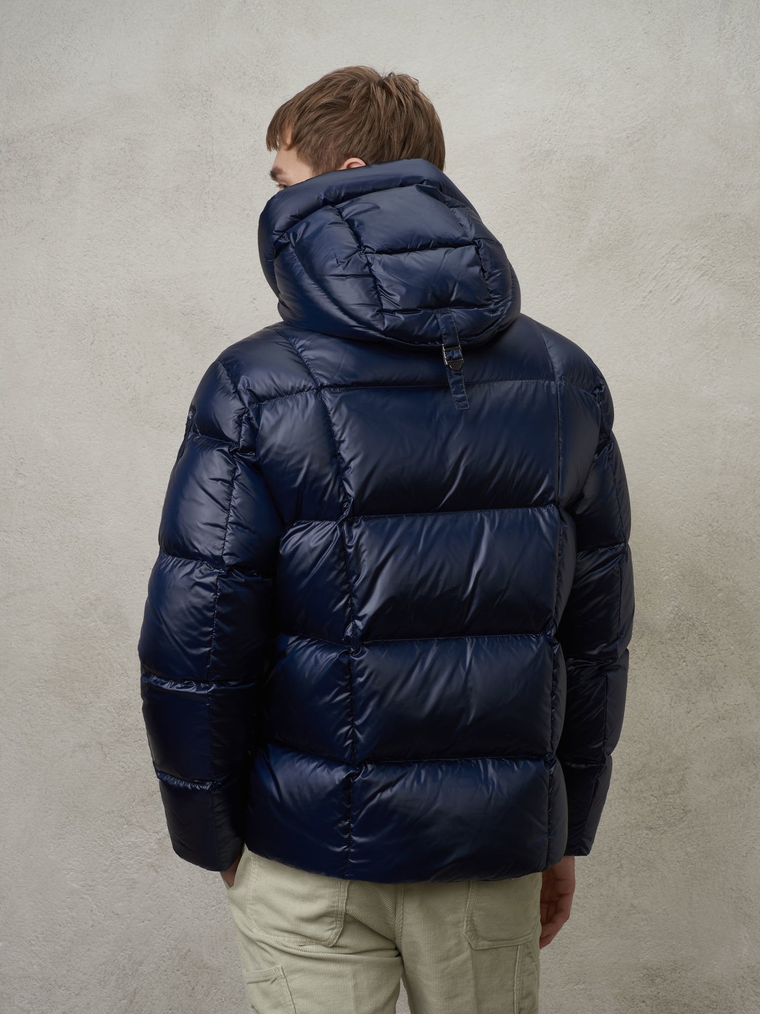 Nylon down jacket with intersecting horizontal and vertical stripe stitching.