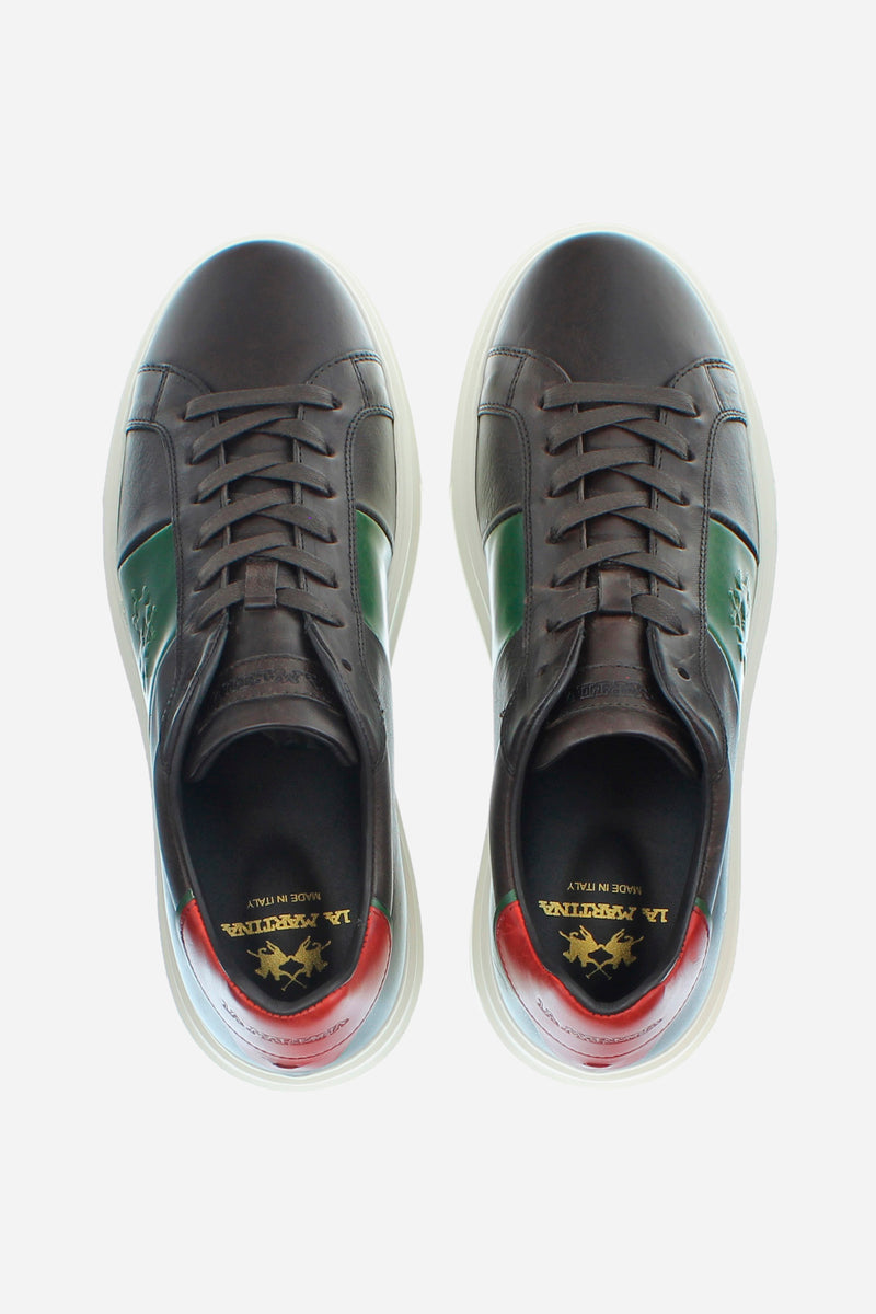 This dark brown leather sneaker by La Martina combines refined craftsmanship with contemporary style. Featuring premium embossed leather detailing, it offers subtle texture and sophistication. The extra-light sole enhances comfort and agility for all-day wear, making it ideal for those who value both elegance and practicality in their footwear. Its durable yet breathable design ensures lasting performance without compromising on aesthetic appeal.