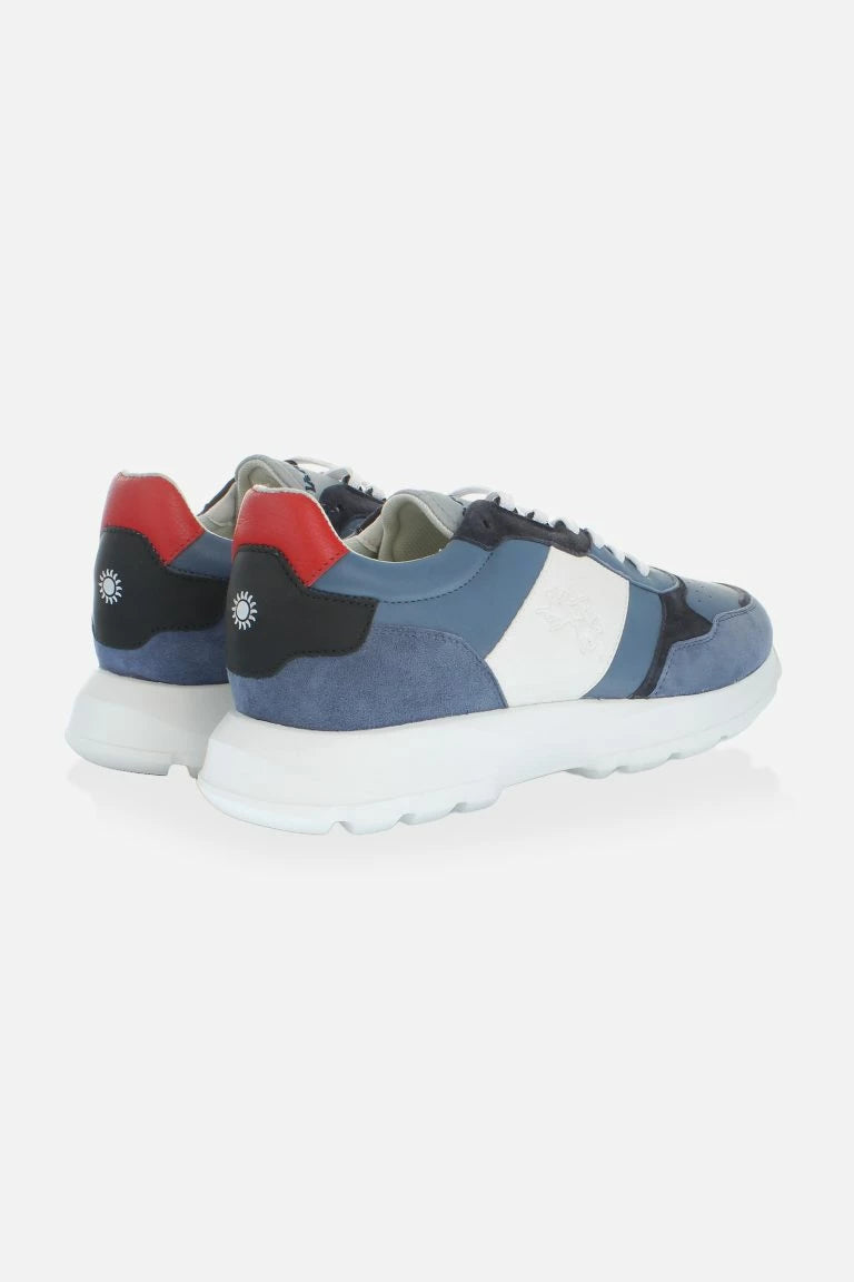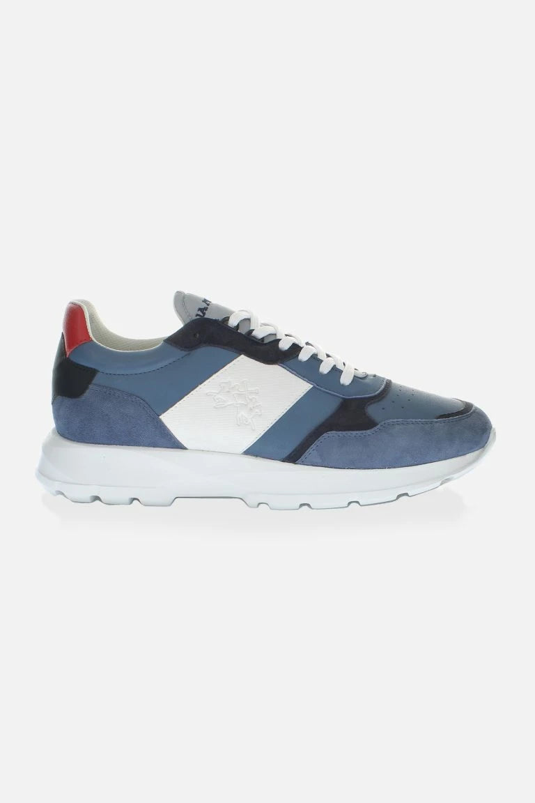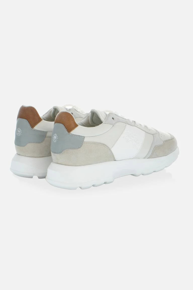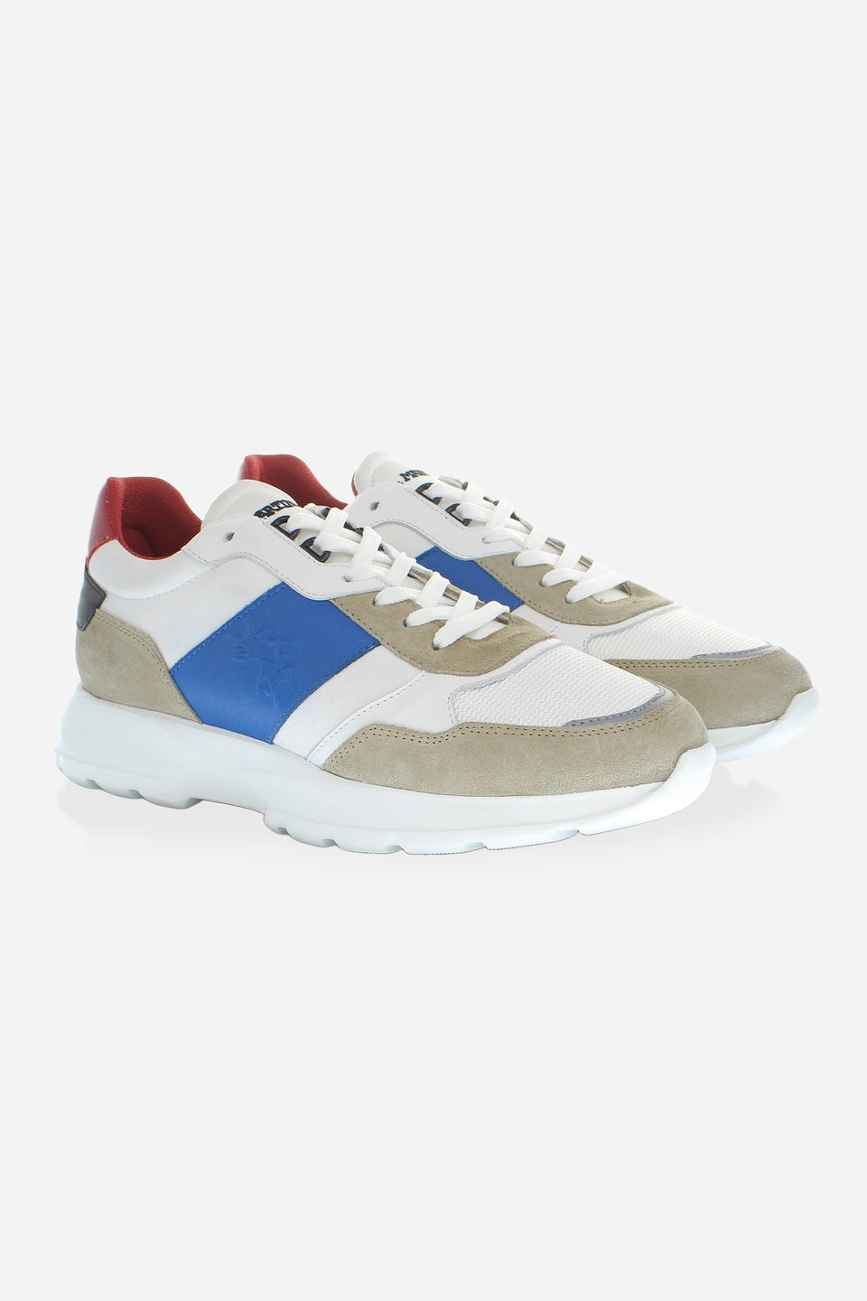 Lace up Nubuck and nylon runner with extra light skid grip rubber sole, and leather embossed LM logo