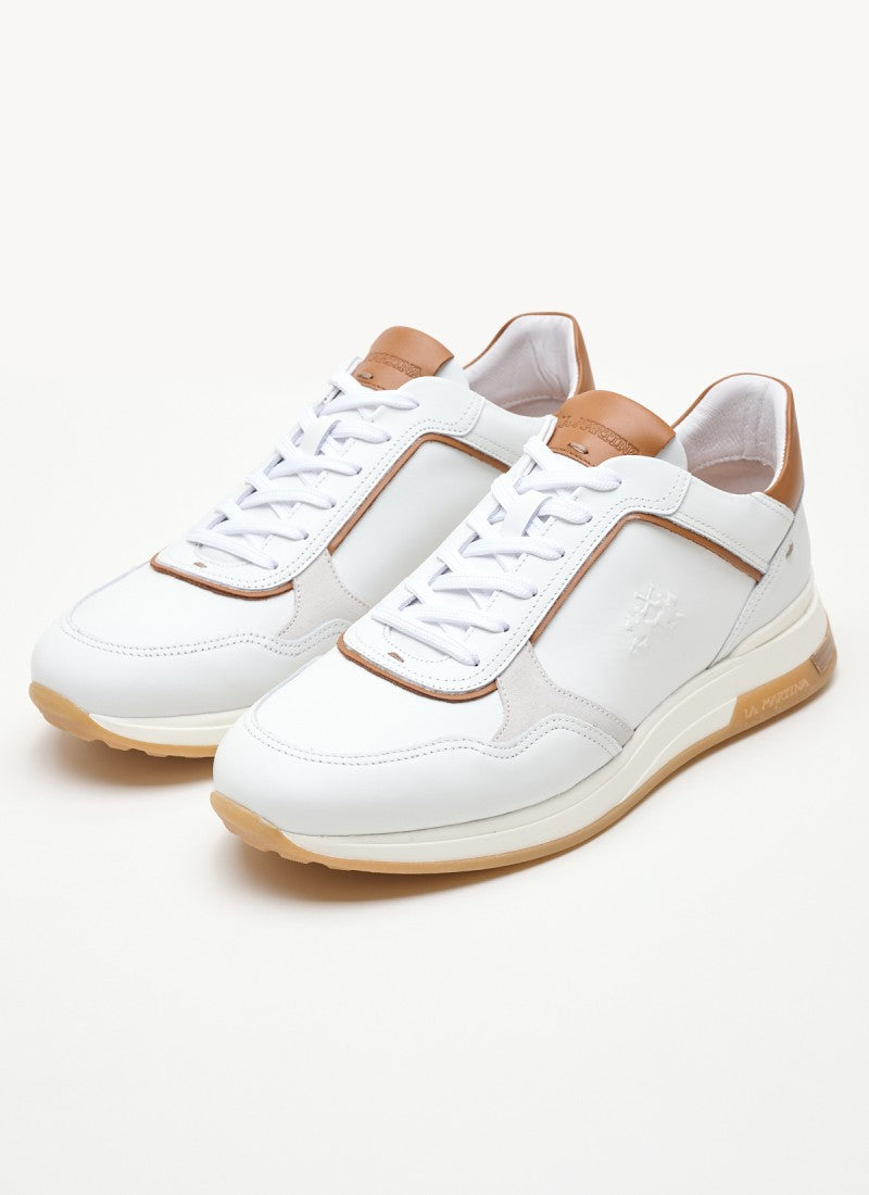 This leather trainer style sneaker offers a sleek and sophisticated look while providing durability and comfort. Made with high-quality leather, it offers a timeless and versatile option for any outfit. Upgrade your style and step with confidence in these expertly crafted sneakers.