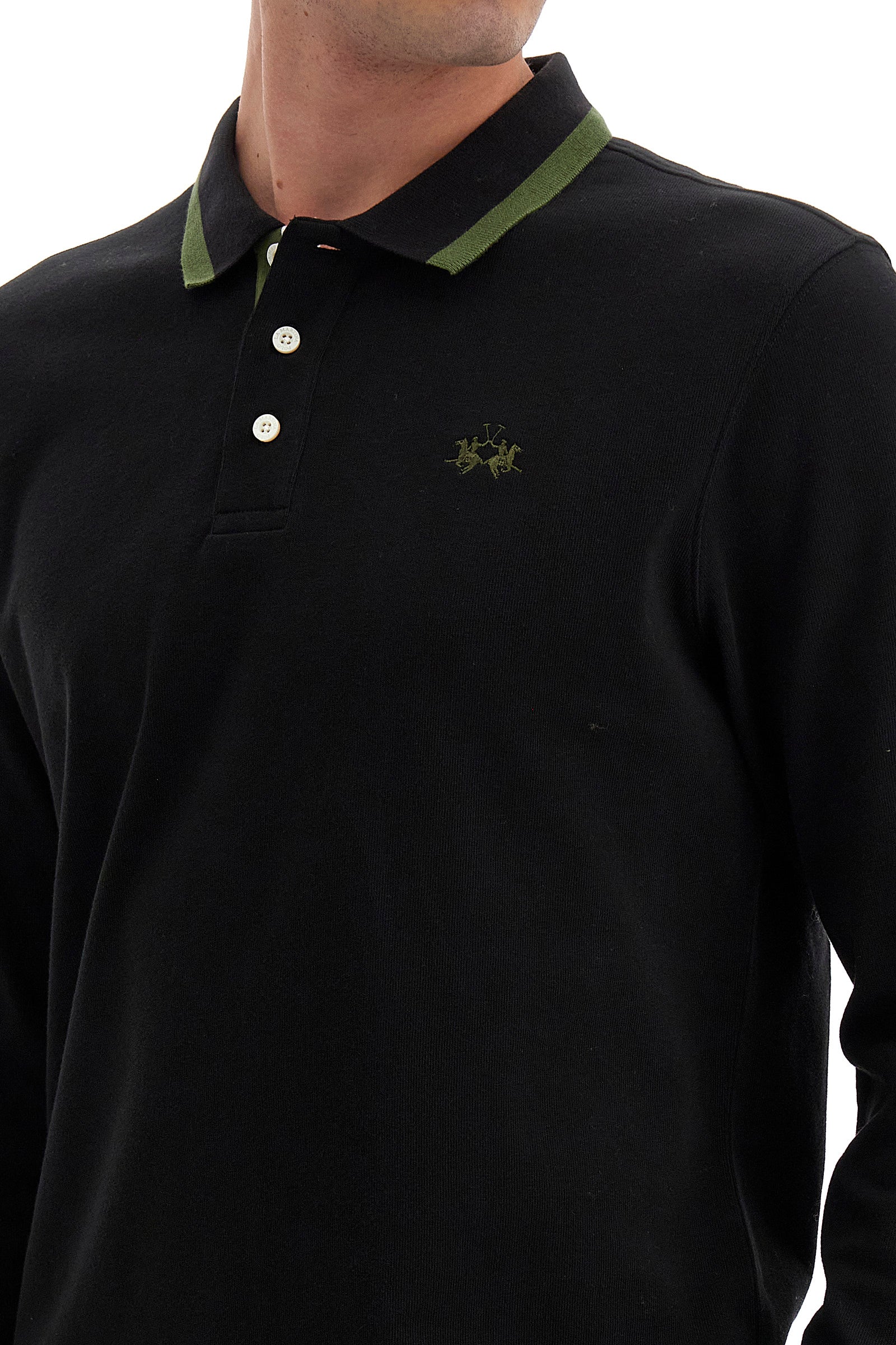 Stay stylish and warm this winter with our men's long sleeve polo. Featuring a complementary stripe on the collar and our subtle embroidered LM logo on the chest, this 3-button polo is perfect for any occasion. Stay comfortable and fashionable with our classic design.