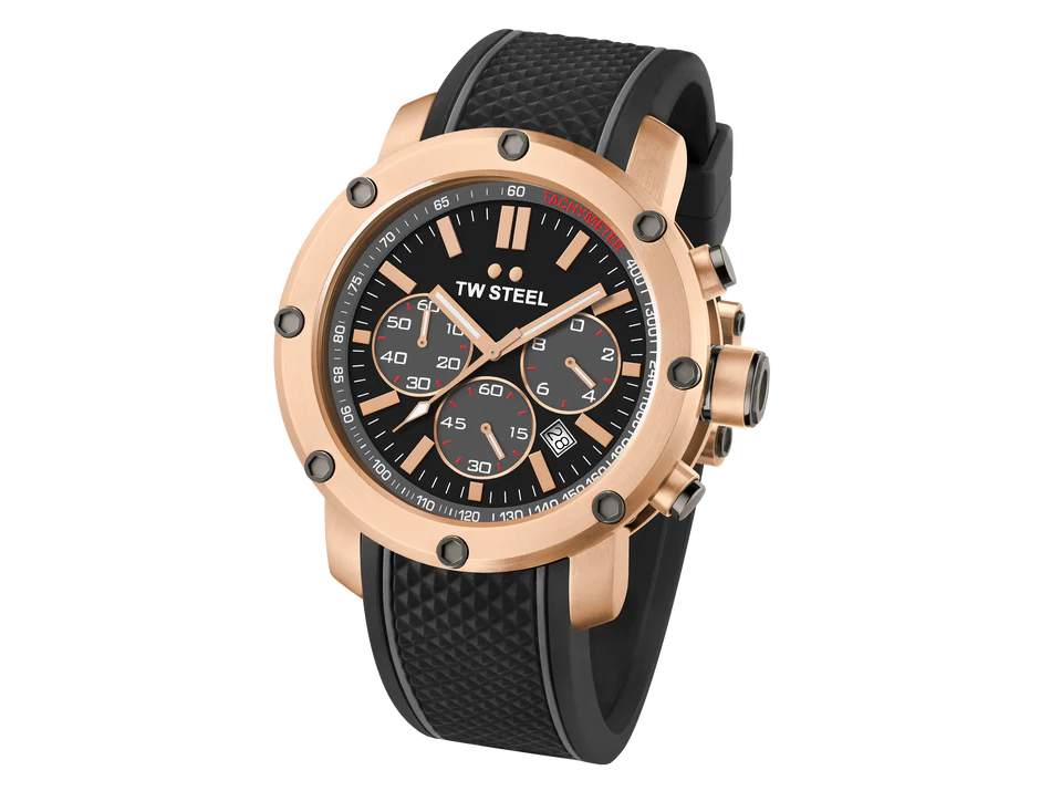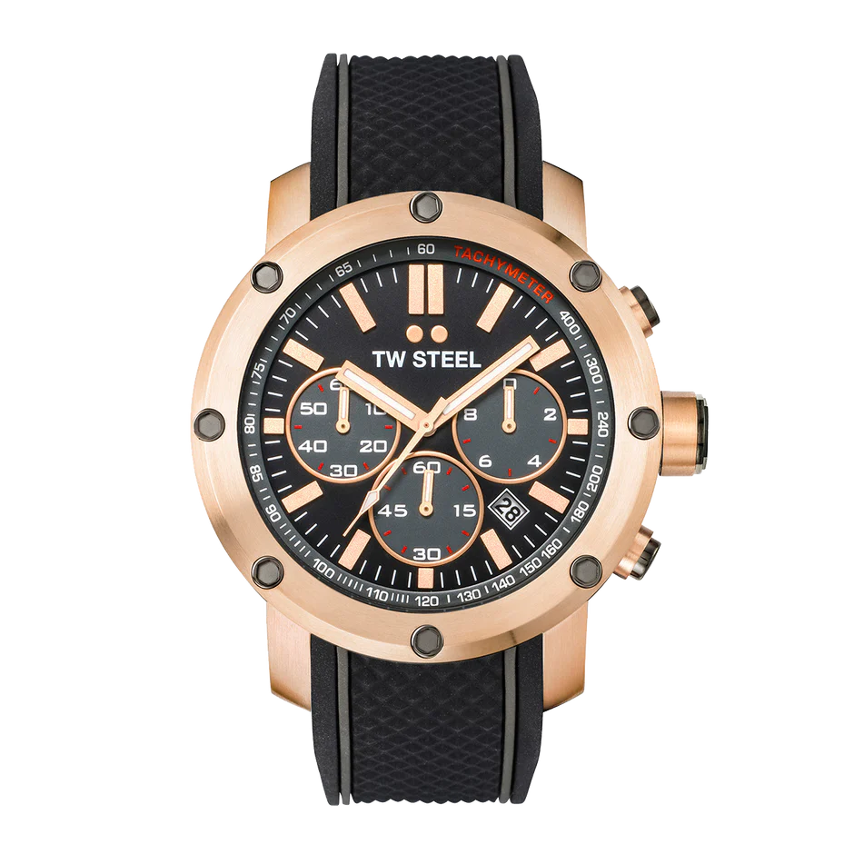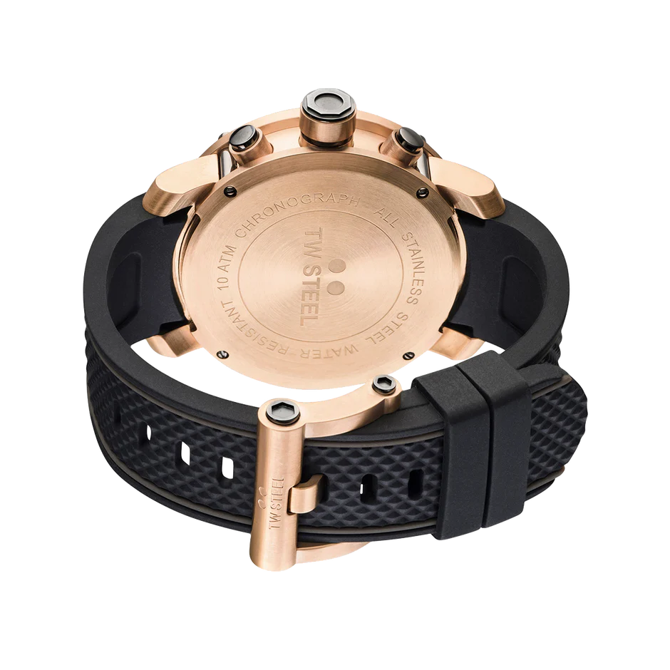 A perfect fusion of masculine and industrial-inspired styling. This Grandeur Tech features a PVD rose gold plated steel case, a black dial and a black silicon strap with grey lines.