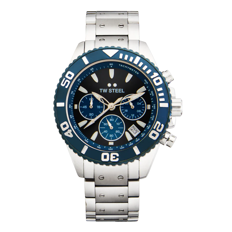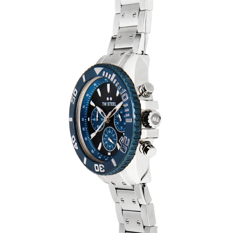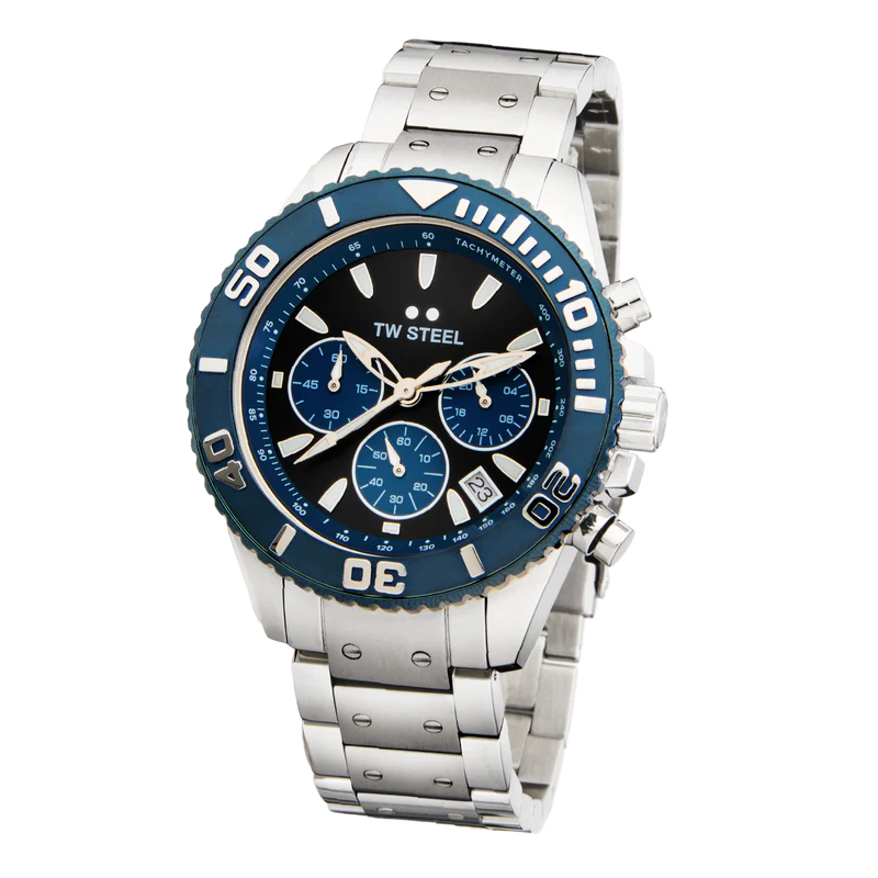 With the Vanceur Diver collection, TW Steel navigates in style. The VA6 features a chronograph with a shiny steel case, blue rotating diver bezel, a steel strap, 10 ATM and a 2-year global warranty.